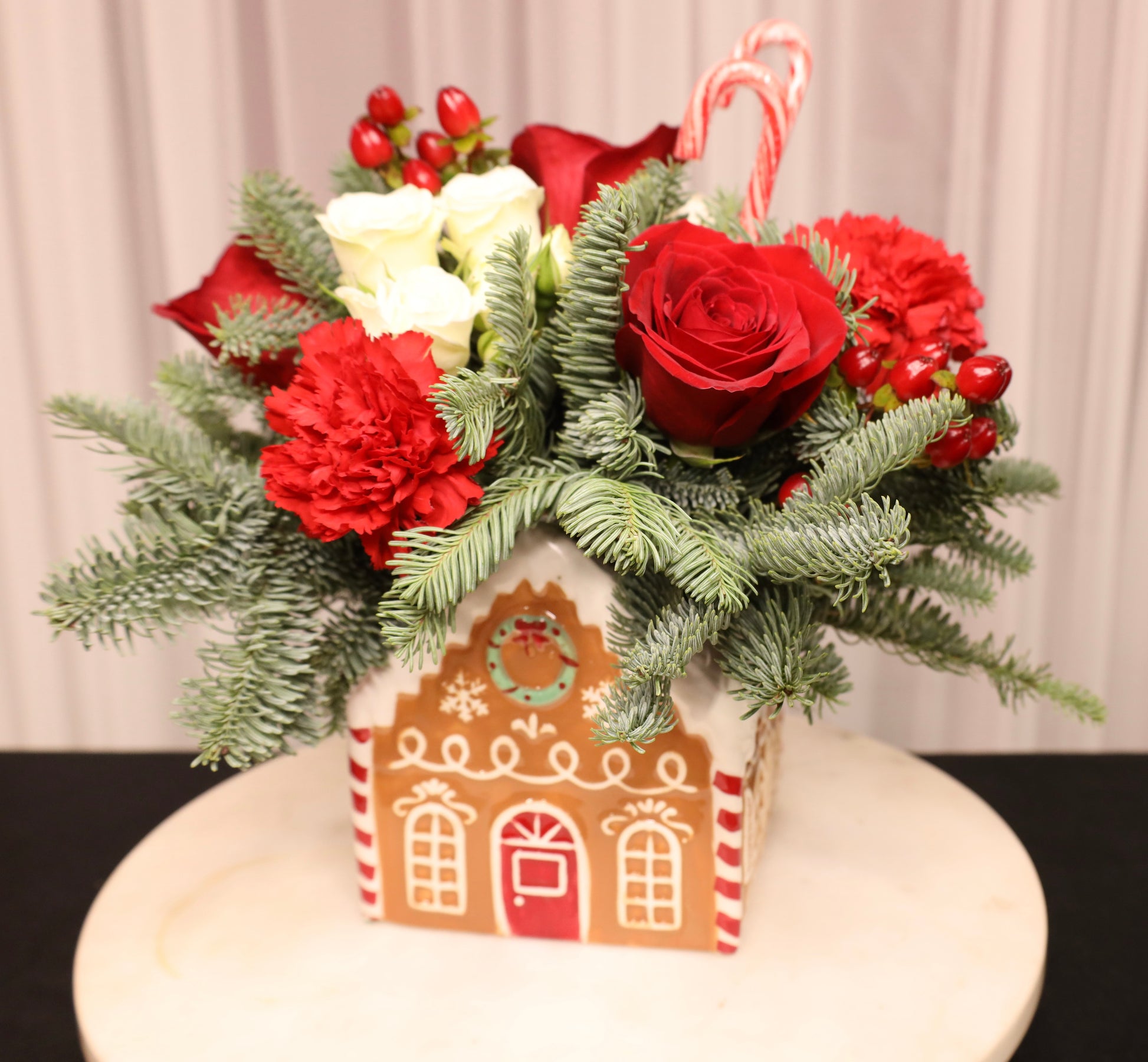 Arranged in an adorable keepsake gingerbread house container, complete with candy-cane stripes and snowy details, it’s topped with candy cane accents for the perfect whimsical touch.